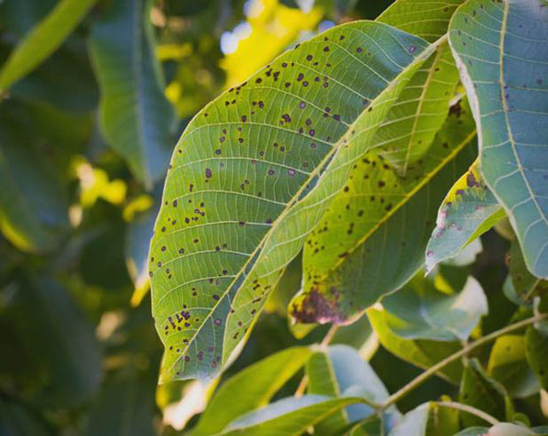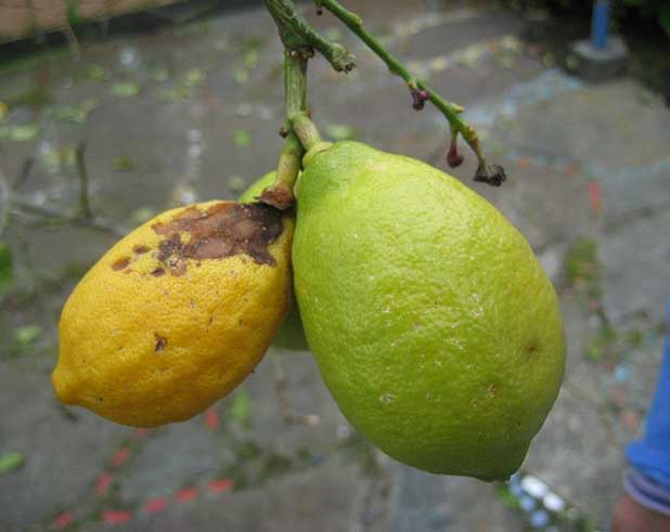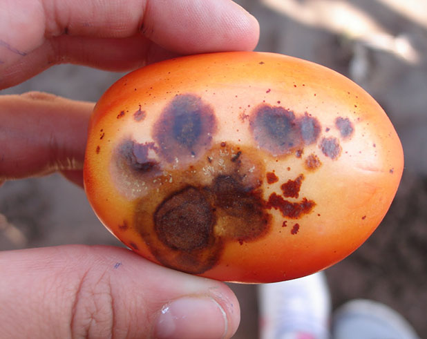Las manchas pequeñas y claras aumentan de tamaño rápidamente y oscurecen. Cada mancha tiene un borde amarillento. Si l ataque es grave las manchas se fusionan y la hoja se marchita. En los tallos y en los peciolos se desarrollan unas áreas grandes de moho rosado que ennegrecen más tarde. Los frutos pueden ser atacados apareciendo manchas negruzcas.