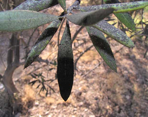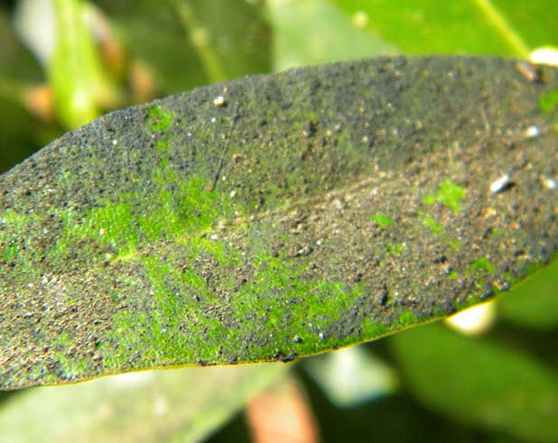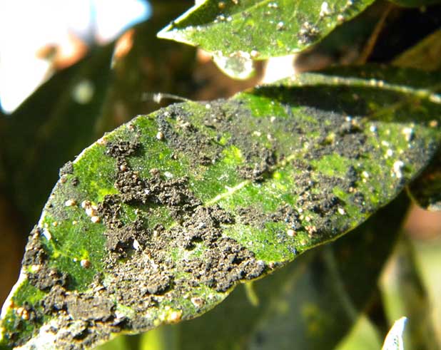 Todas las partes de la planta (hojas, ramas, frutos, troco) se recubren de una costra negruzca o polvo. La negrilla casi siempre es consecuencia de la presencia de cochinillas.