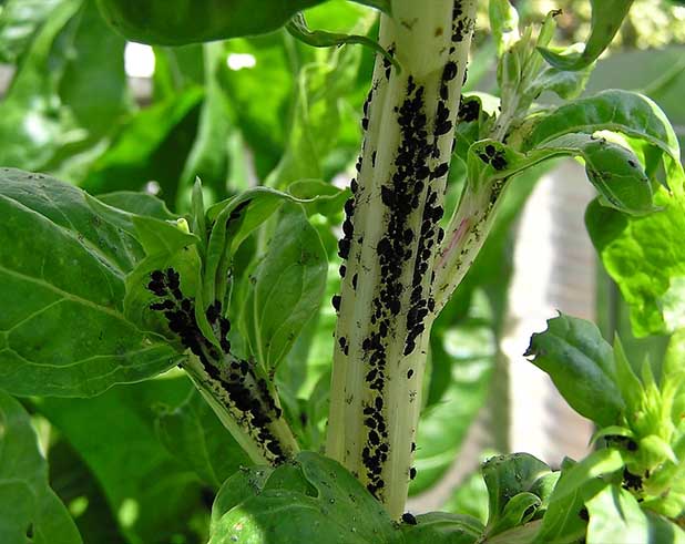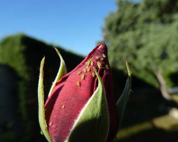 Los pulgones son chupadores y suelen localizarse en la cara inferior de las hojas y en los brotes. Absorben los jugos de la planta, lo que produce deformaciones de las hojas que se enrollan y acaban por secarse.