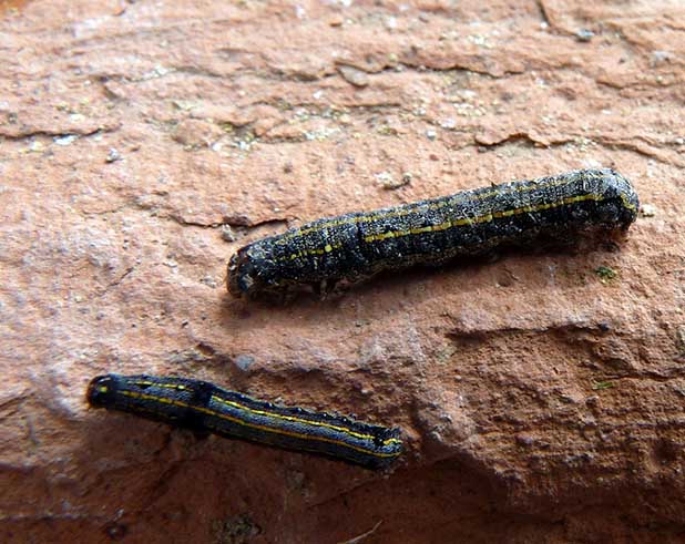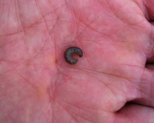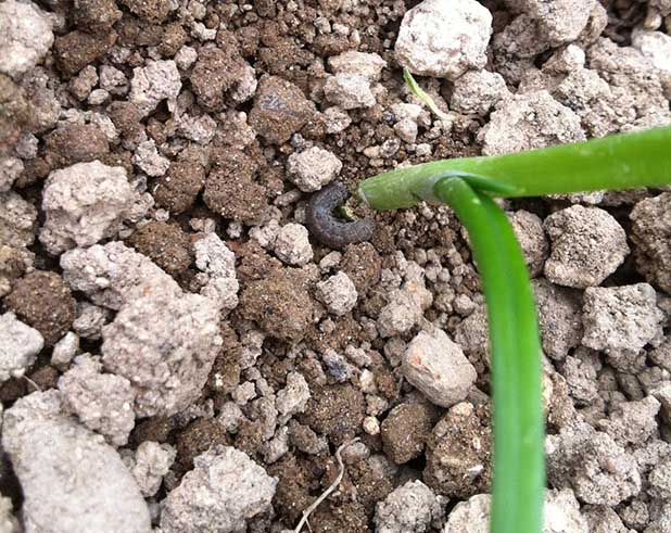 La rosquilla (Spodoptera littoralis) es una oruga que vive enroscada bajo tierra y sale por la noche para trasladarse y comer el cuello de las plantas jovenes.